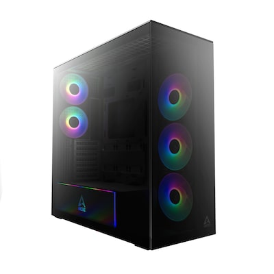 • E-ATX Gaming Gehäuse mit Seitenfenster und ARGB Beleuchtung • Abmessung: 529 (L) x 231 (B) x 529 (H) mm, 15,4 kg • 3× 2,5″ HDD-Käfig: 2x 3,5″ oder 2,5″ + 1x 2,5″ • 5 ARGB-Lüfter inklusive (3x 140mm, 2×120 mm), wasserkühlungsgeeignet • 2x Staubfilter, VGA max bis zu 482 mm (337 mm mit Seitenradiator)