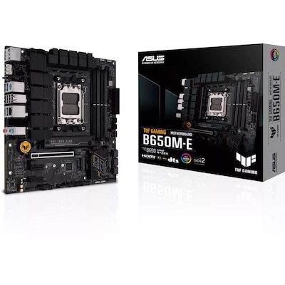 • mATX Mainboard mit Sockel AMD AM5 für AMD RYZEN 7000 Serie-CPU • AMD B650-Chipsatz, PCIe 4.0, Radeon Vega Grafik (Ryzen CPU) Grafik • 128 GB max. RAM, DDR5 bis zu 6400MHz • RGB-Beleuchtung Aura Sync, ASUS 5x Protection III, TUF Features • 2x DisplayPort, 1x HDMI, 3x USB 3.2, 4x USB 3.0, 6x USB 2.0, 1xUSB-C,