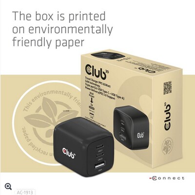 cyberport | Club3D Club 3D Reise Ladegerät PPS 65W GAN, USB Typ-C/Typ-A Power Delivery (PD) 3.0 | 08719214472658