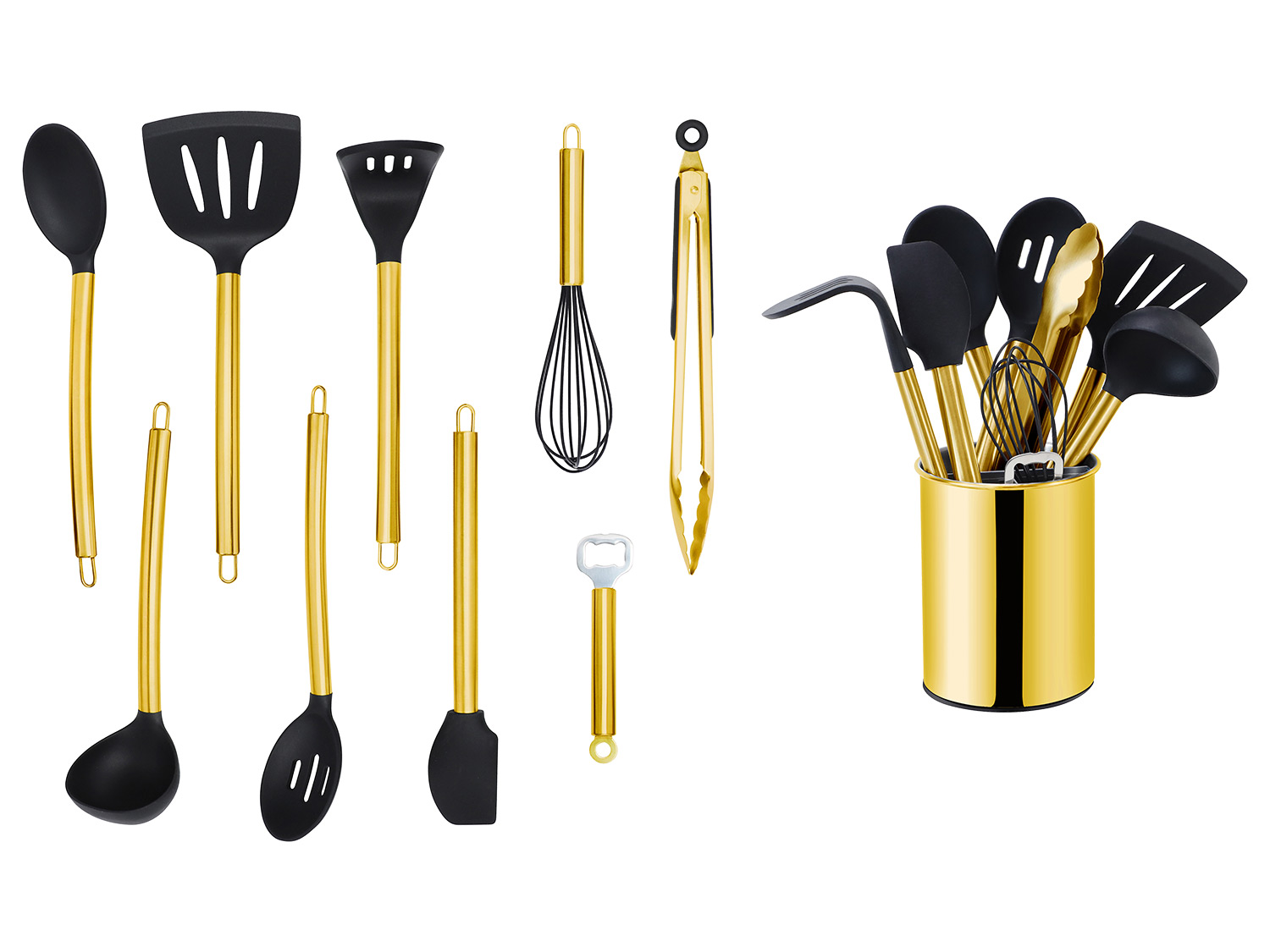 Dekoratives sowie praktisches Küchenhelfer-Set Griffe sowie Utensilienhalter hergestellt aus hochwertigem Edelstahl Utensilienköpfe hergestellt aus strapazierfähigem Silikonmaterial 7, 10 oder 12-teiliges Set für alle Anwendungsmöglichkeiten Lebensmittelecht Handwäsche empfohlen Set Zusammensetzung 7-teilig: 1 x Utensilienhalter ca. 13 x 16 cm 1 x Schlitzwender ca. 35 cm 1 x Fester Löffel ca. 34 cm 1 x Schneebesen ca. 25,5 cm 1 x Suppenlöffel ca. 30 cm 1 x Geschlitzter Löffel ca. 34 cm 1 x Küchenschaber 34 cm Set Zusammensetzung 10-teilig: 1 x Utensilienhalter ca. 13 x 16 cm 1 x Schlitzwender ca. 35 cm 1 x Fester Löffel ca. 34 cm 1 x Schneebesen ca. 25,5 cm 1 x Suppenlöffel ca. 30 cm 1 x Geschlitzter Löffel ca. 34 cm 1 x Küchenschaber ca. 34 cm 1 x Kartoffelstampfer ca. 32 cm 1 x Servierzange ca. 33,5 cm 1 x Flaschenöffner Set Zusammensetzung 12-teilig: 1 x Utensilienhalter ca. 13 x 16 cm 1 x Schlitzwender ca. 35 cm 1 x Fester Löffel ca. 34 cm 1 x Schneebesen ca. 25,5 cm 1 x Suppenlöffel ca. 30 cm 1 x Geschlitzter Löffel ca. 34 cm 1 x Küchenschaber ca. 34 cm 1 x Kartoffelstampfer ca. 32 cm 1 x Servierzange ca. 33,5 cm 1 x Flaschenöffner 1 x Pizzaroller 1 x Schäler