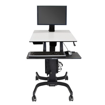 • Anpassbar zwischen Sitzen und Stehen • Bietet 63 cm reibungslose vertikale Höhenverstellung • Umfasst eine ergonomische, nach hinten klappbare Tastaturablage • Kabelführungsbox für sechs Mehrfachsteckdosen • Für Standard Displays von 2,3-7,3 Kg