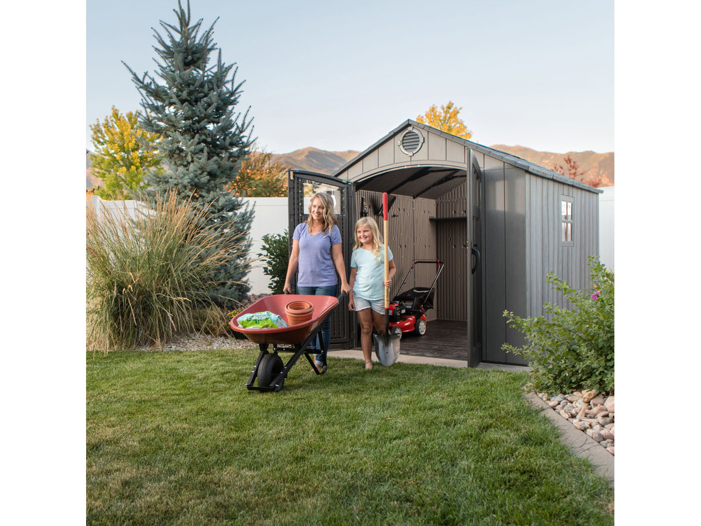 Einfacher Aufbau Wetterfest und UV-beständig Kein Verwittern oder Rosten Inkl. Bodenplatte und umfangreichem Zubehör Trägt Schneelasten bis zu 115 kg/m² 10 Jahre Herstellergarantie auf das komplette Haus Material Doppelwandiger Kunststoff ca. 26 mm Maße ca. 305 x 244 x 244 cm Gewicht ca. 220 kg Lieferumfang Gerätehaus Anti-Rutsch-Boden 2x Lufteinlass mit Insektenschutz Lichteinlass über den kompletten First 1x Seitenfenster zum Öffnen 2x Lichteinlass in der Türe 1x Regal 228 x 25cm 6x Wandhaken