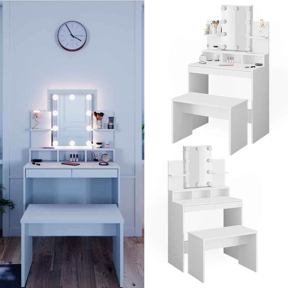 Artikelbeschreibung • Energieeffizenzklasse: E • Mit unserem hochwertigen Schminktisch Ania wird Ihre Schminkroutine zum Vergnügen. • Dank der vielen Ablagen und Schubfächer werden Sie ausreichen Platz und Stauraum für alle Ihre Schminkartikel finden.